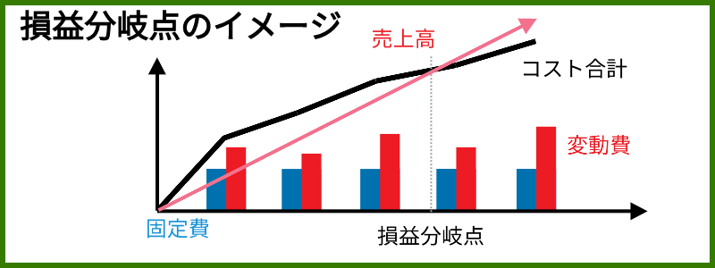 損益分岐点は「売上=固定費+変動費」となる点、ようするに利益も損失も出ない点のことを「損益分岐点」と言います。